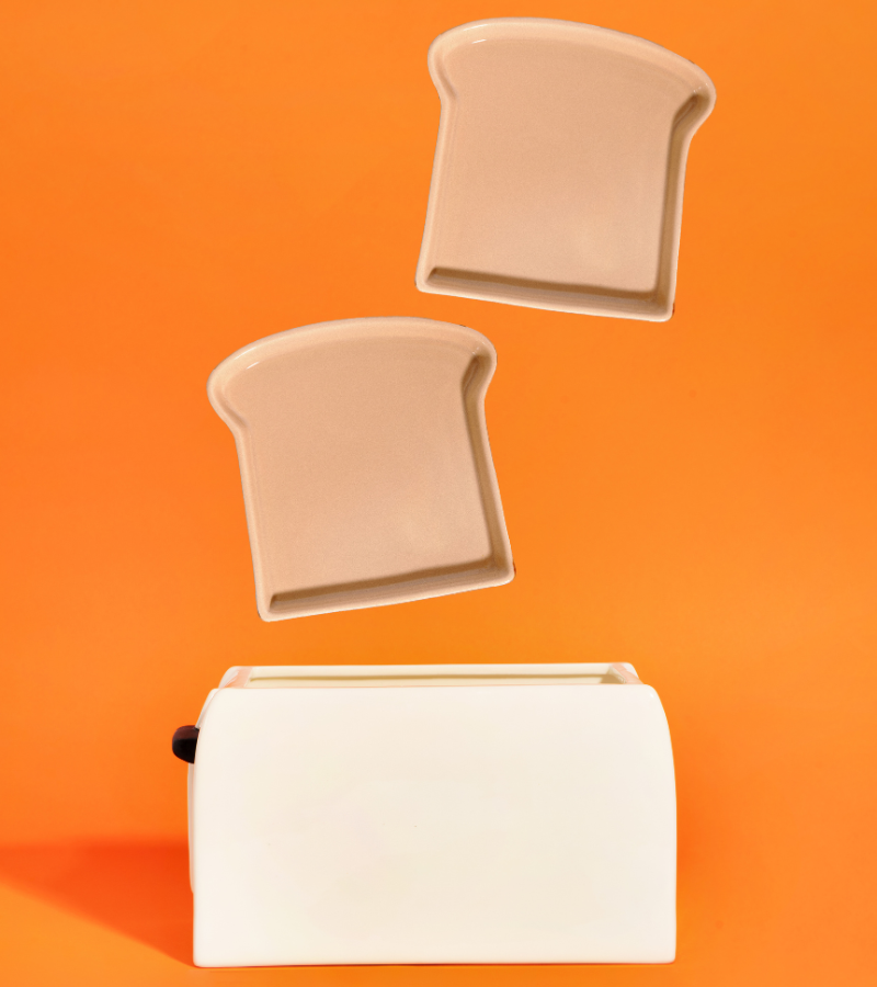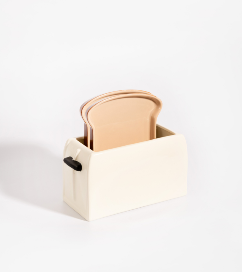 Dale un toque peculiar y creativo a tu mesa con estos platos de cerámica con forma de rebanadas de pan tostado. Ubicados en un soporte estilo tostadora, combinan practicidad y estética lúdica para alegrar tus desayunos o pausas de café 🍞