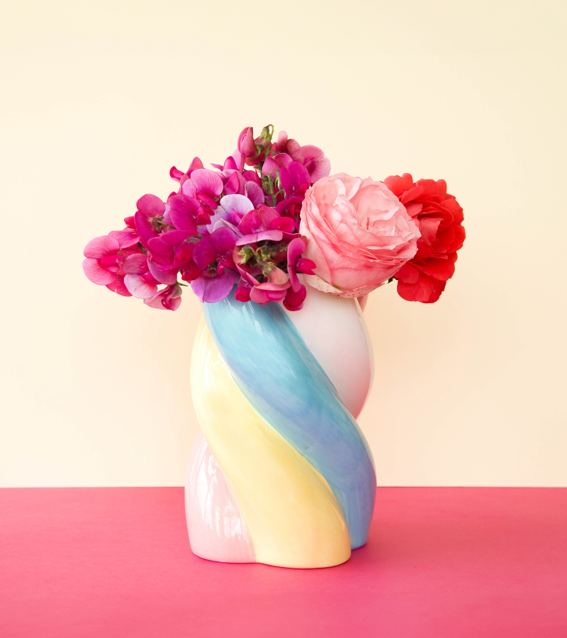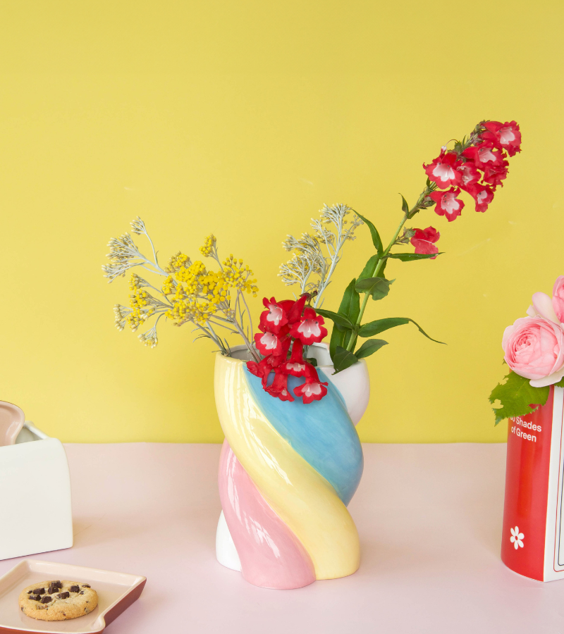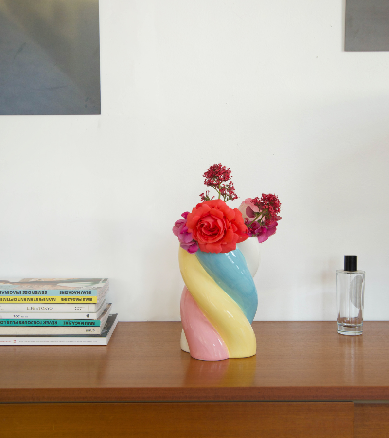 Añade un toque de suavidad y elegancia a tu decoración con el jarrón de cerámica Marshmallow. Sus colores pastel –azul, amarillo, rosa y blanco– se entrelazan en un diseño retorcido único y delicioso, evocando ligereza y modernidad. Ideal para realzar sus flores o como objeto decorativo, este jarrón escultural aportará un toque lúdico y refinado a su interior.