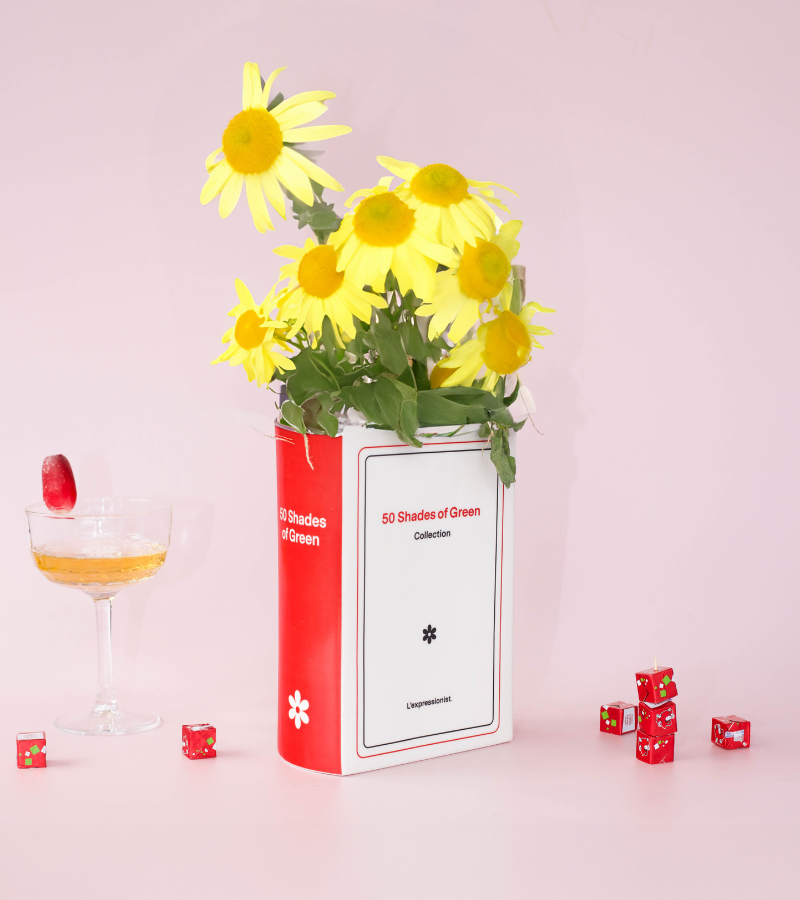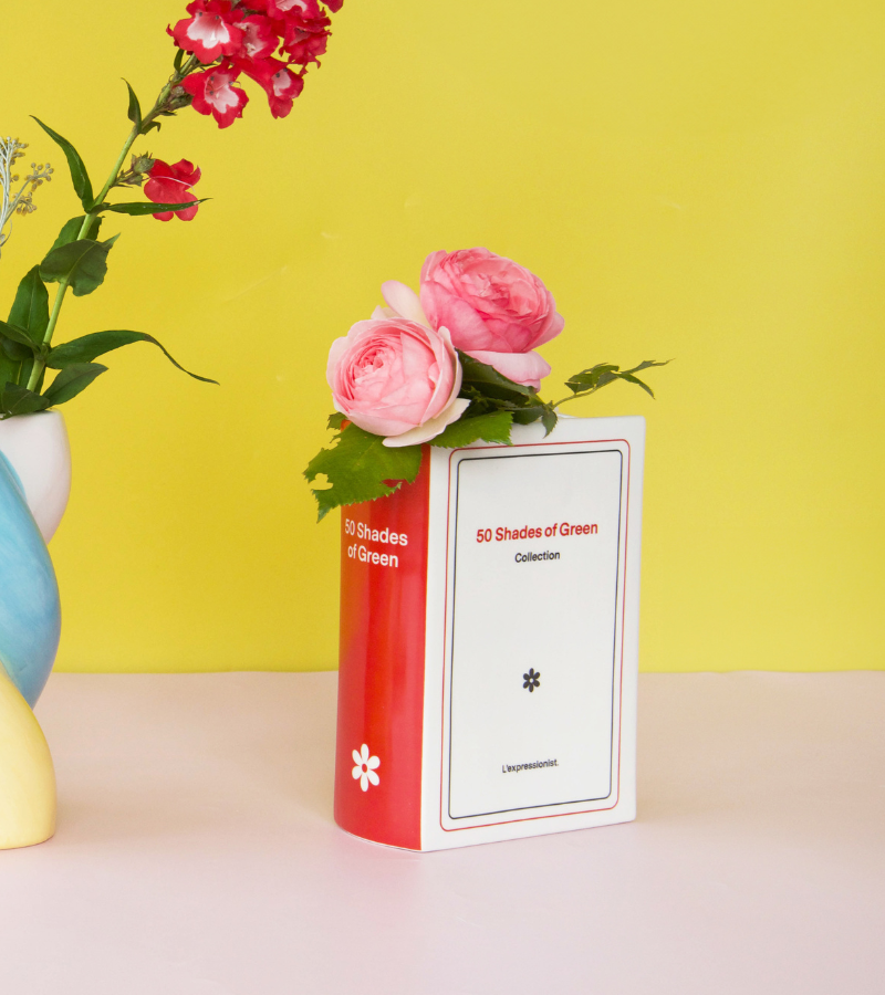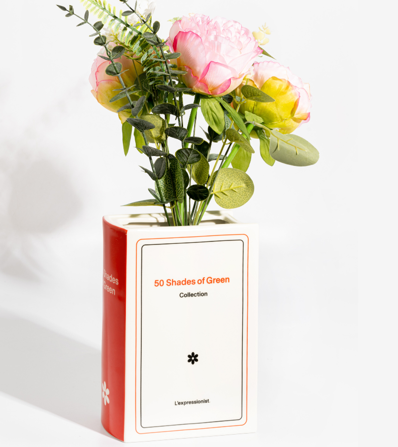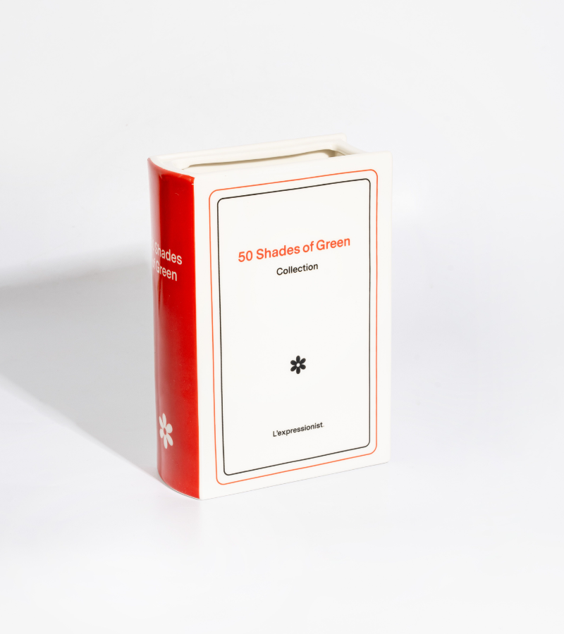 Original jarrón de cerámica en forma de libro que lleva el humorístico título *50 Tonos de Verde*. Perfecto para añadir un toque divertido y de diseño a tu decoración.