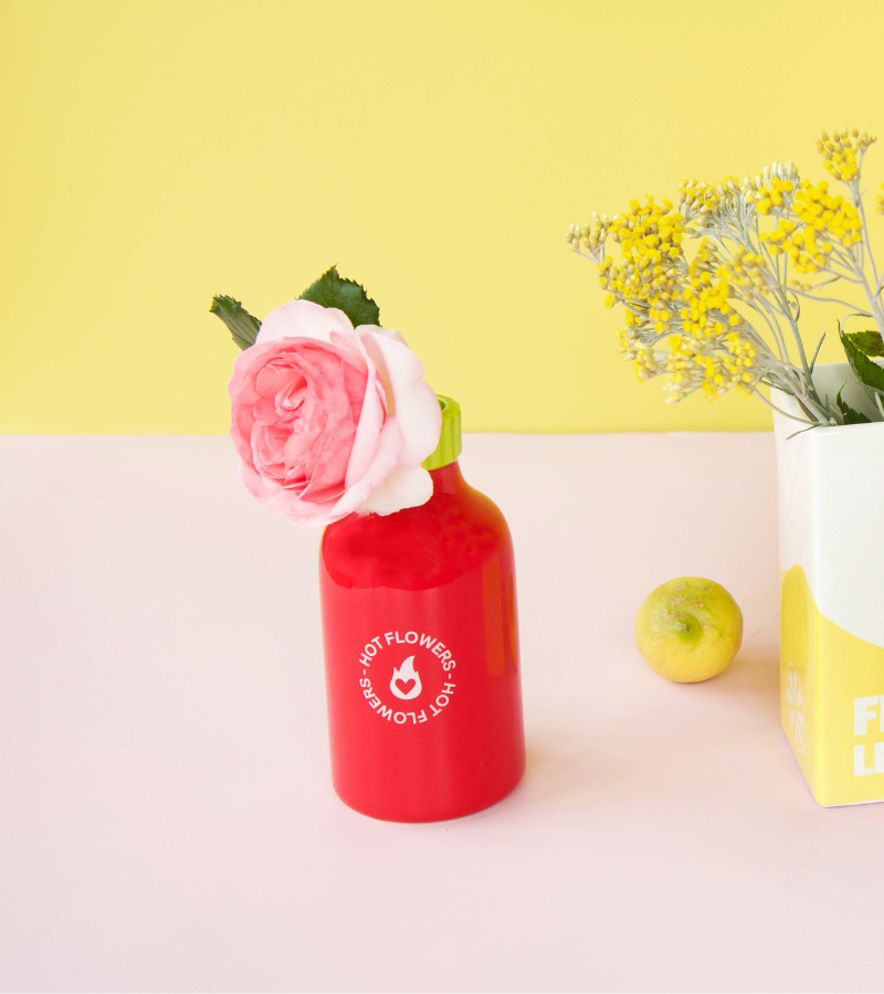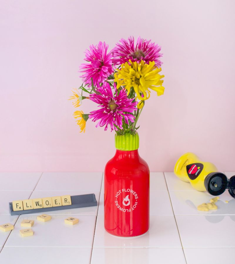 Jarrón de cerámica atrevido, con forma de botella de salsa picante, con la inscripción *Hot Flowers*. ¡Una pieza peculiar para darle vida a tu decoración!